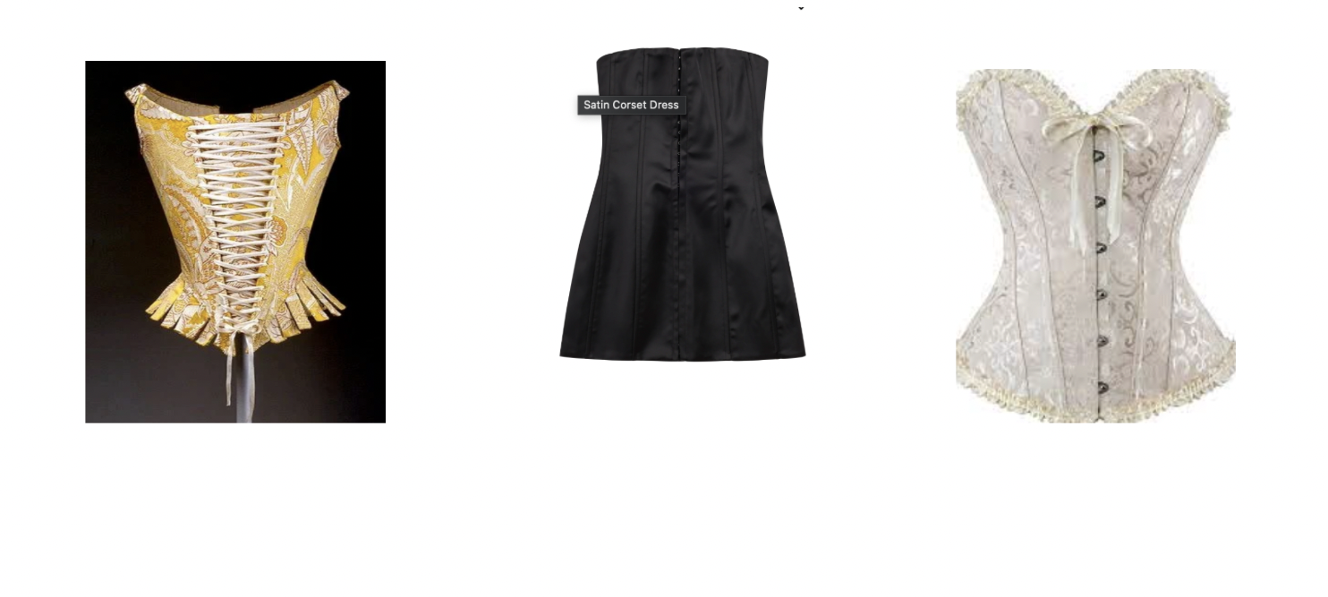 We see a return of the corset beginning in the 1990s and continuing even well over thirty years later. Corsets have been adapted to not only be form-fitting but to incorporate elements of style and support, taking various new and innovative forms. Trending designer Danielle Guizio has mastered the craft of the corset, and has found a way to make what was previously never meant to be seen a high-end garment. Guizio’s satin corset, sold in a variety of colors, has additionally been transformed into a corset dress. The dress embodies the same stylistic elements of the original corset- clasps to be done up, tight fitting, supportive- but this time is able to do so while upholding the current most popular styles and being fit for a wide range of occasions.